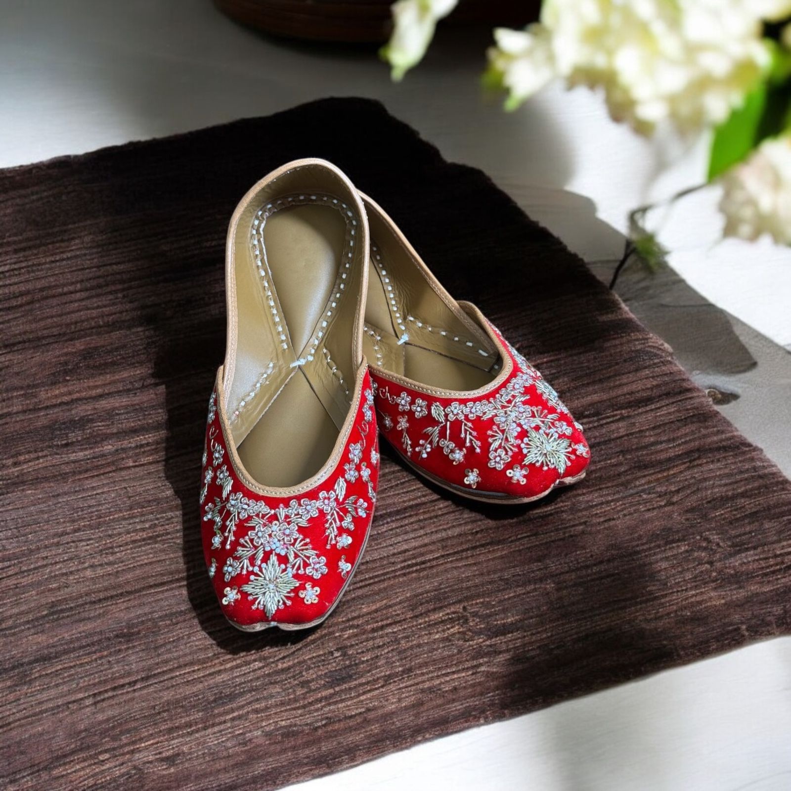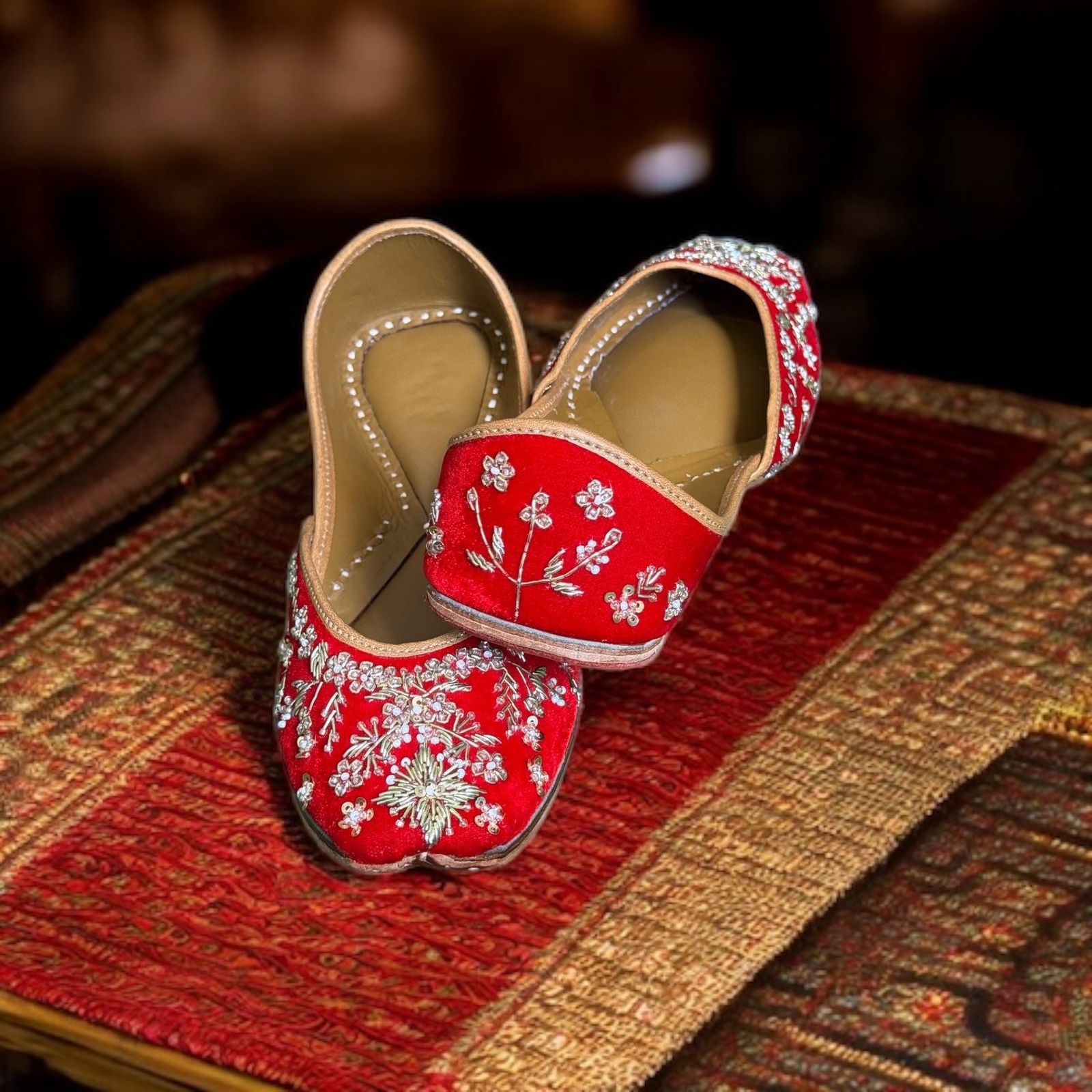 “A step in red, a sparkle in every thread — these juttis don’t just walk, they make an entrance.”