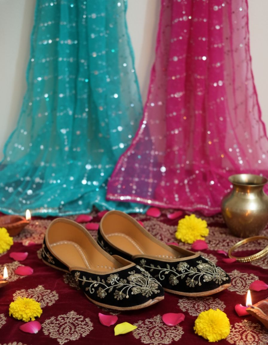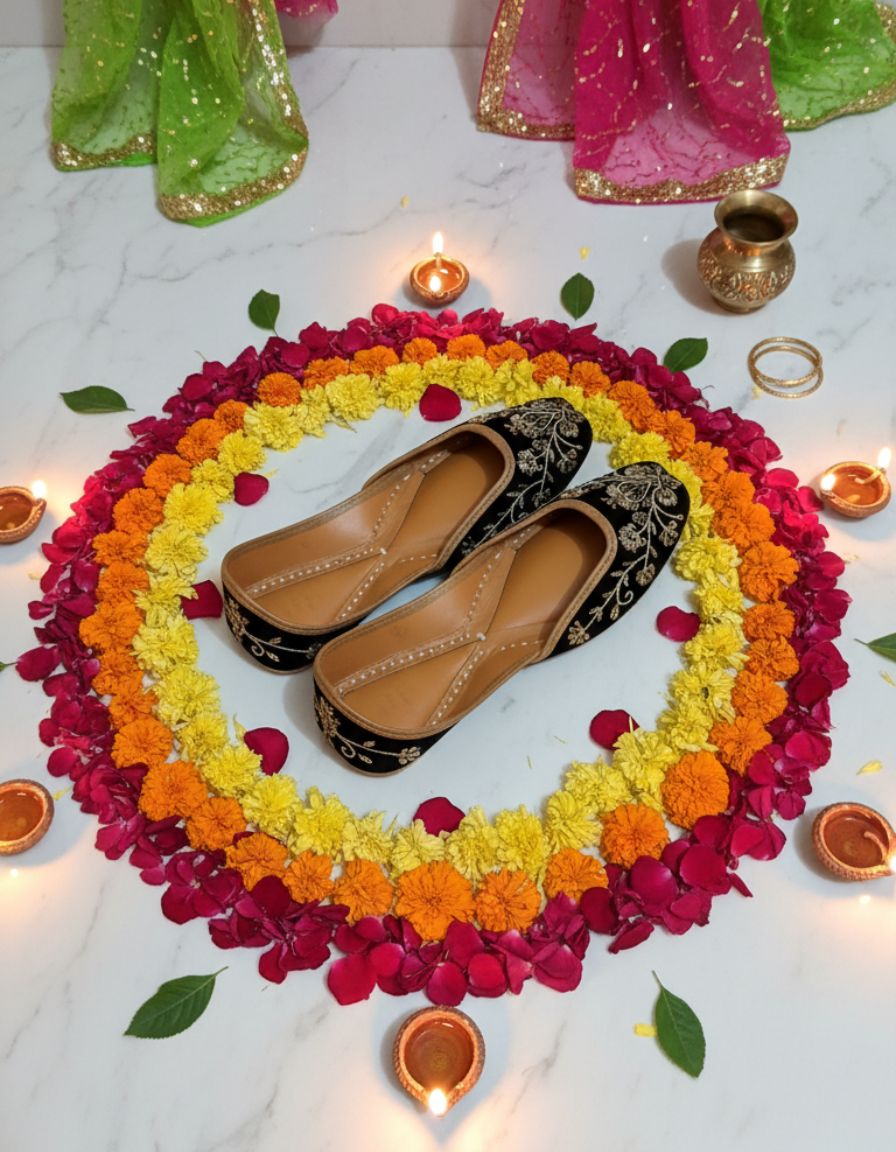 These are a pair of traditional Indian juttis crafted with intricate detailing. The uppers feature rich black fabric adorned with elaborate gold embroidery in floral and vine motifs, giving them a regal and festive appearance. The shoes have a structured square toe, adding a contemporary touch to a classic design. The inner lining is tan leather with fine white stitching along the edges, forming the signature X-shaped pattern typical of handcrafted juttis. The overall look is elegant, luxurious, and perfect for ethnic or formal wear.