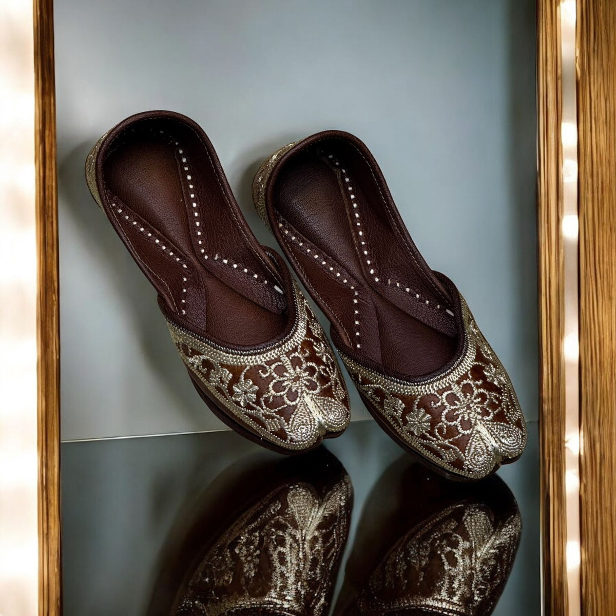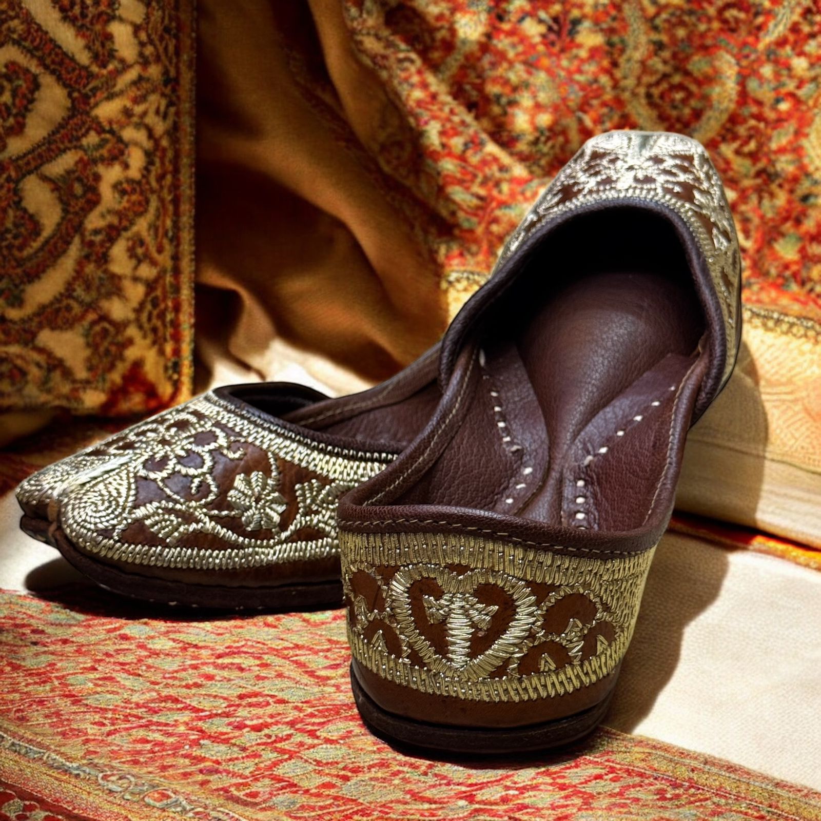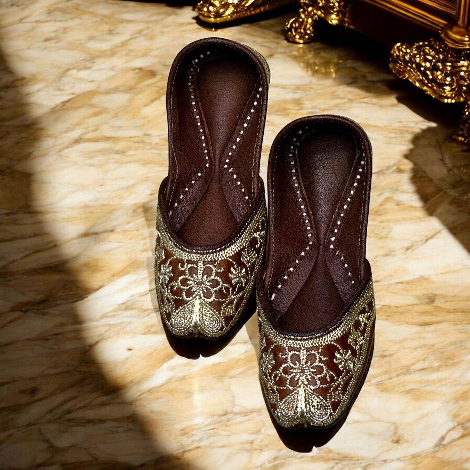 Dark brown pakistani jutti Beautiful embroidery done in golden given Traditional look. Delicate golden zari work done on basic tan brown Juttis, this gorgeous golden work adds sole to juttis. You can pair them with anything in your wardrobe.