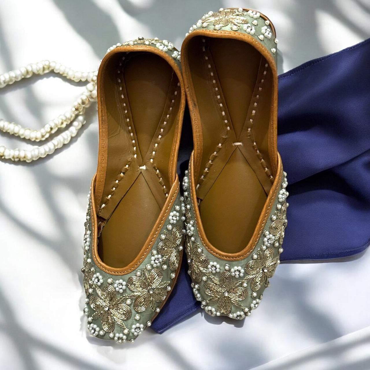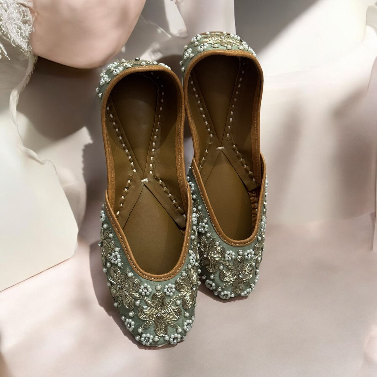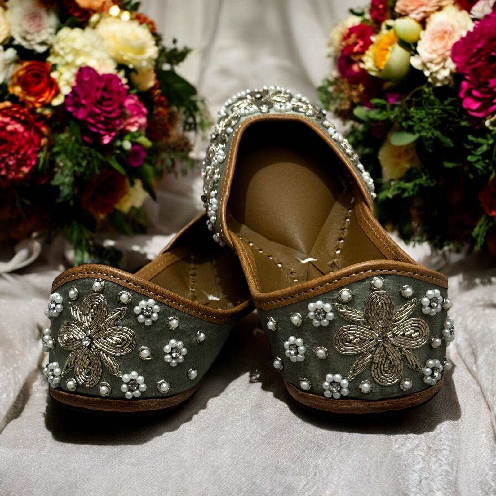 The showstopper of the StepinGrace Collection. Each pair of this exquisite jutti demands 16 hours of meticulous hand embroidery. Pastel pearl and zari work in champagne gold with a dash of peral work fashions the garlands of scallop mesh that engulf the shoes, front and back. Brides looking to add sparkle to their outfit cannot go wrong with this glamorous jutti paired with a beautiful lehenga.