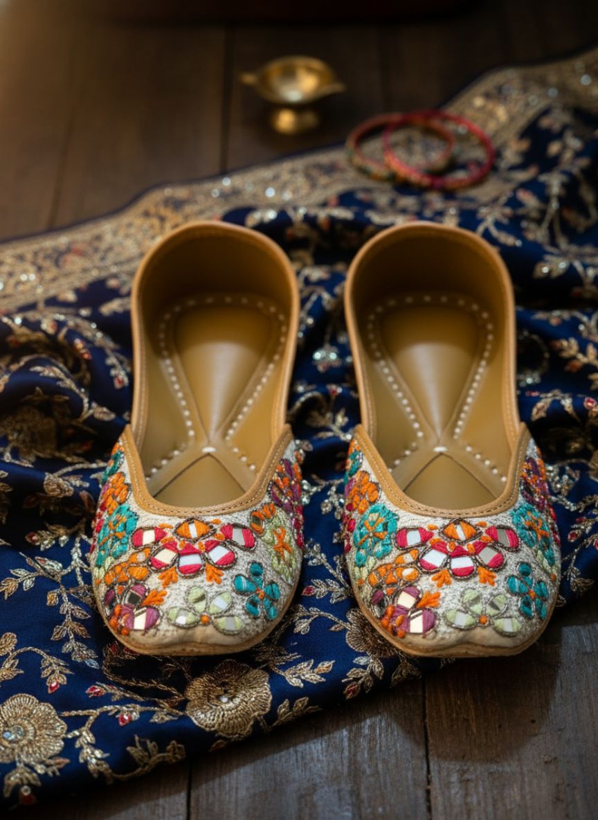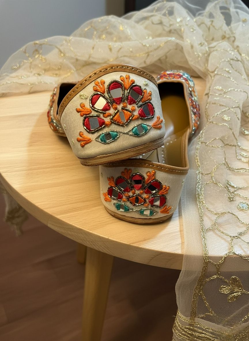 Bright, playful, and full of traditional charm, these multicolour hand-embroidered juttis are a celebration of vibrant Indian craftsmanship. Featuring intricate mirror work paired with colourful thread embroidery, this pair brings together floral and geometric motifs that instantly catch the eye.