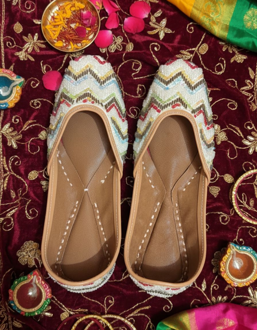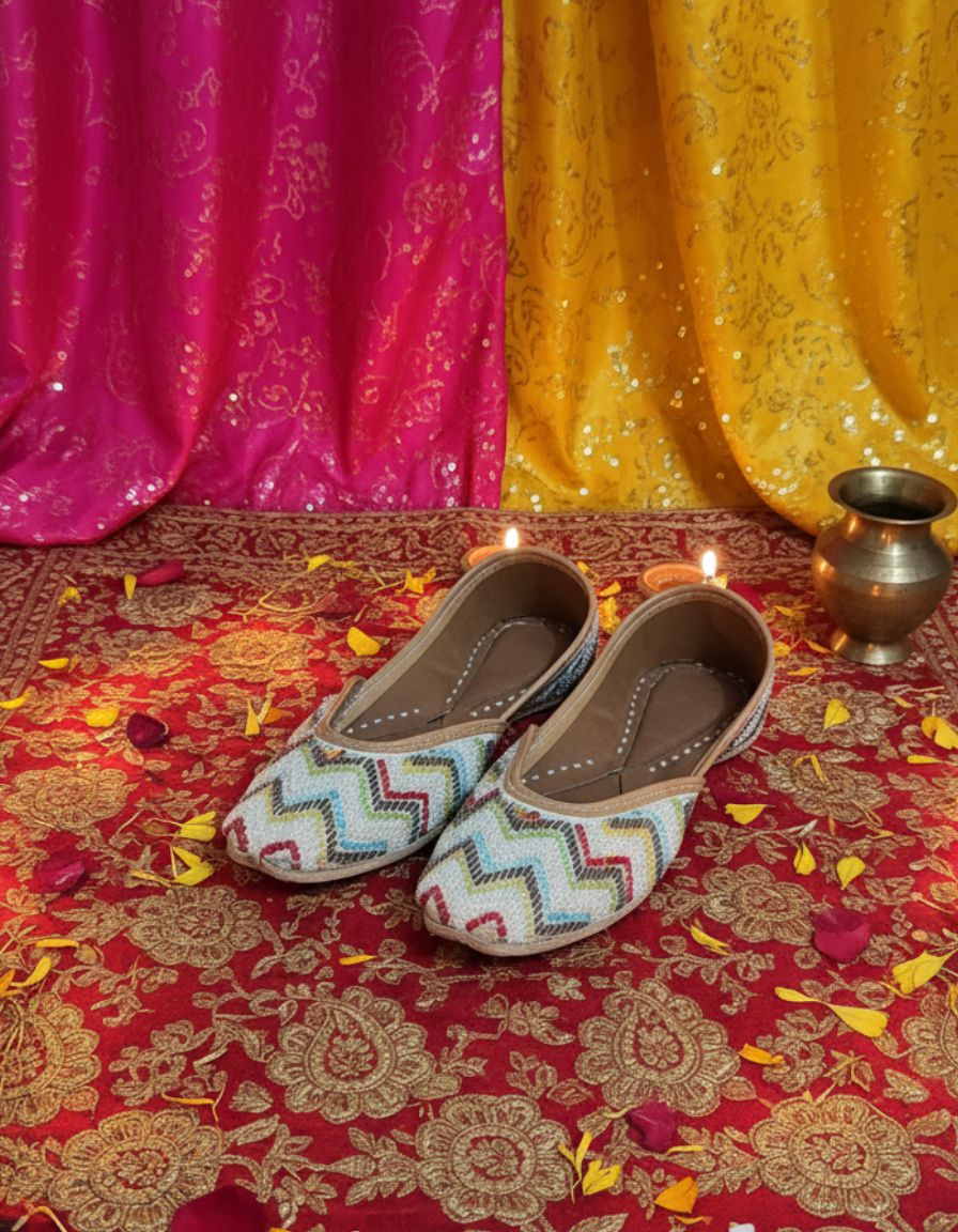 The jutti pair is handcrafted with a colorful, zigzag embroidered pattern featuring shades of green, blue, red, gold, and white. The base material appears to be a textured fabric with intricate threadwork, giving it a festive and elegant look. The inner lining and sole are made of tan leather with traditional stitching along the edges.