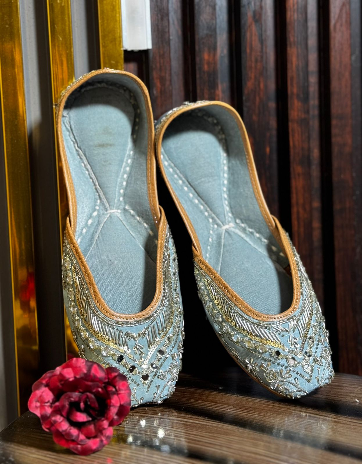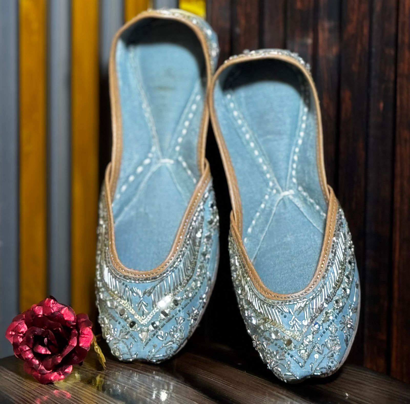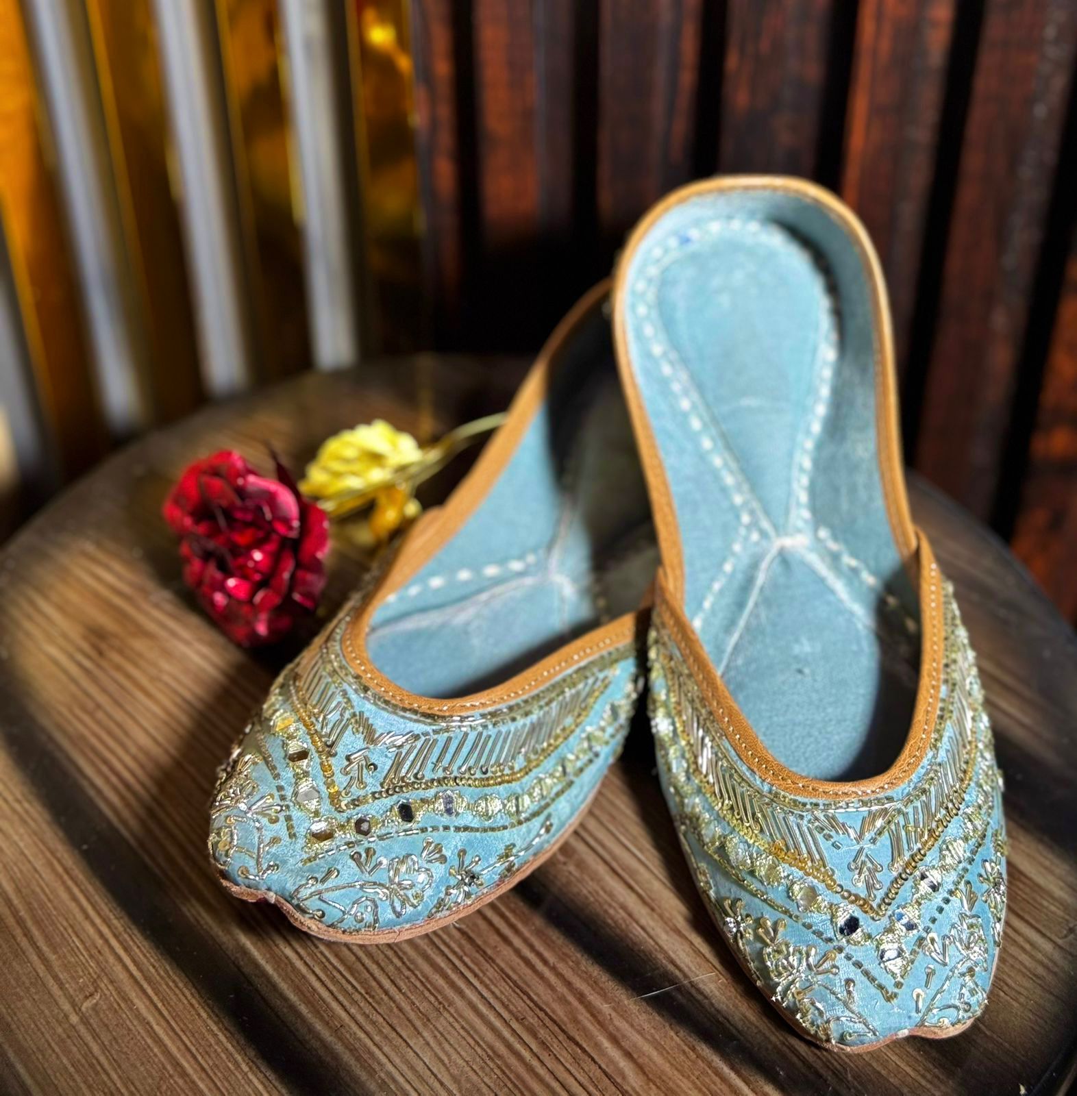 Happy girls are the prettiest” – Powder Blue jutti brings this statement to life in the form of shoes. Zari and mirror work runs freely on a light blue velvet base to uplift your spirits and your outfit. Pastels gives a soothing touch from toe to heel, It has all the makings to be your favorite pair for a fun day in the sun.