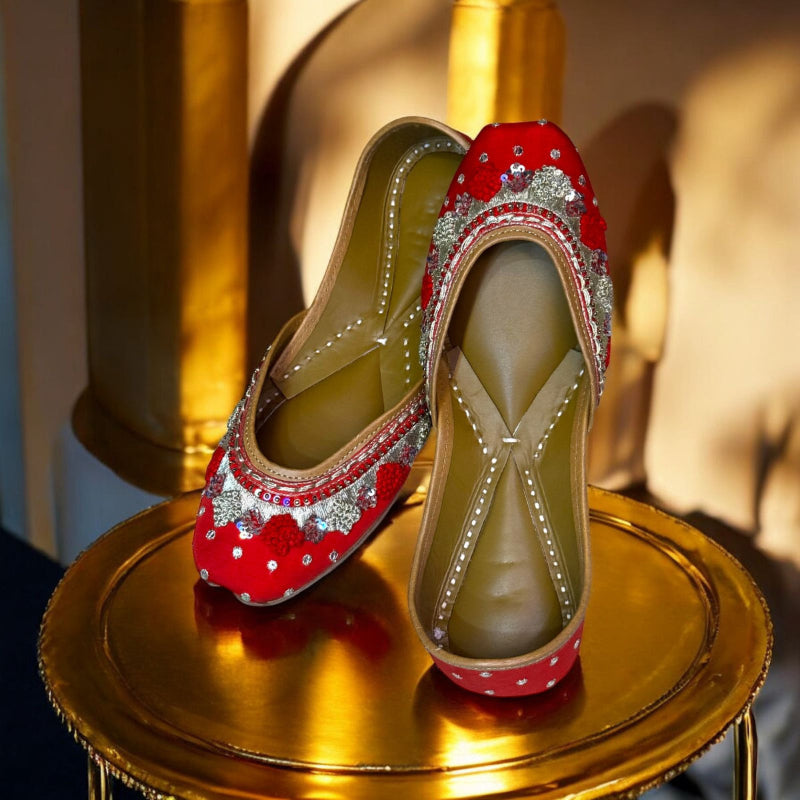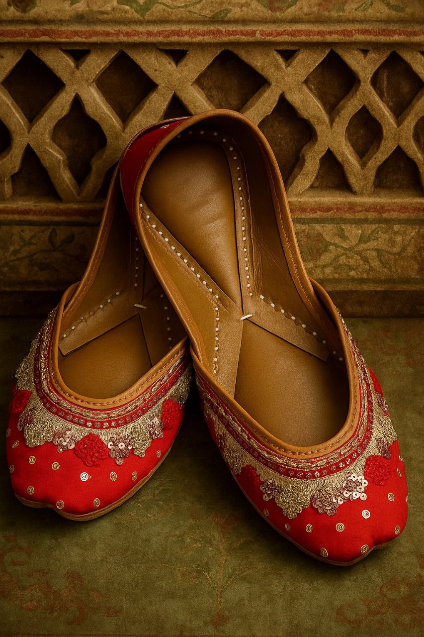 Experience luxury redefined with our premium "Red Thread” juttis, speically for brides, meticulously handcrafted with intricate Thread work. Featuring a heavy jaal in red and golden floral pattern on a soft blush red base, and a striking dott pattern at the back, these juttis epitomize opulence and refinement. Elevate your ensemble with timeless elegance.