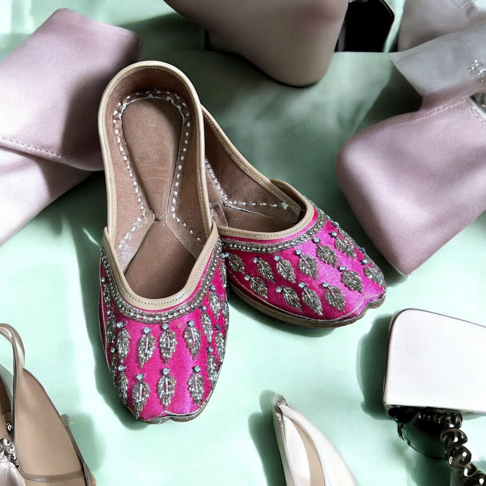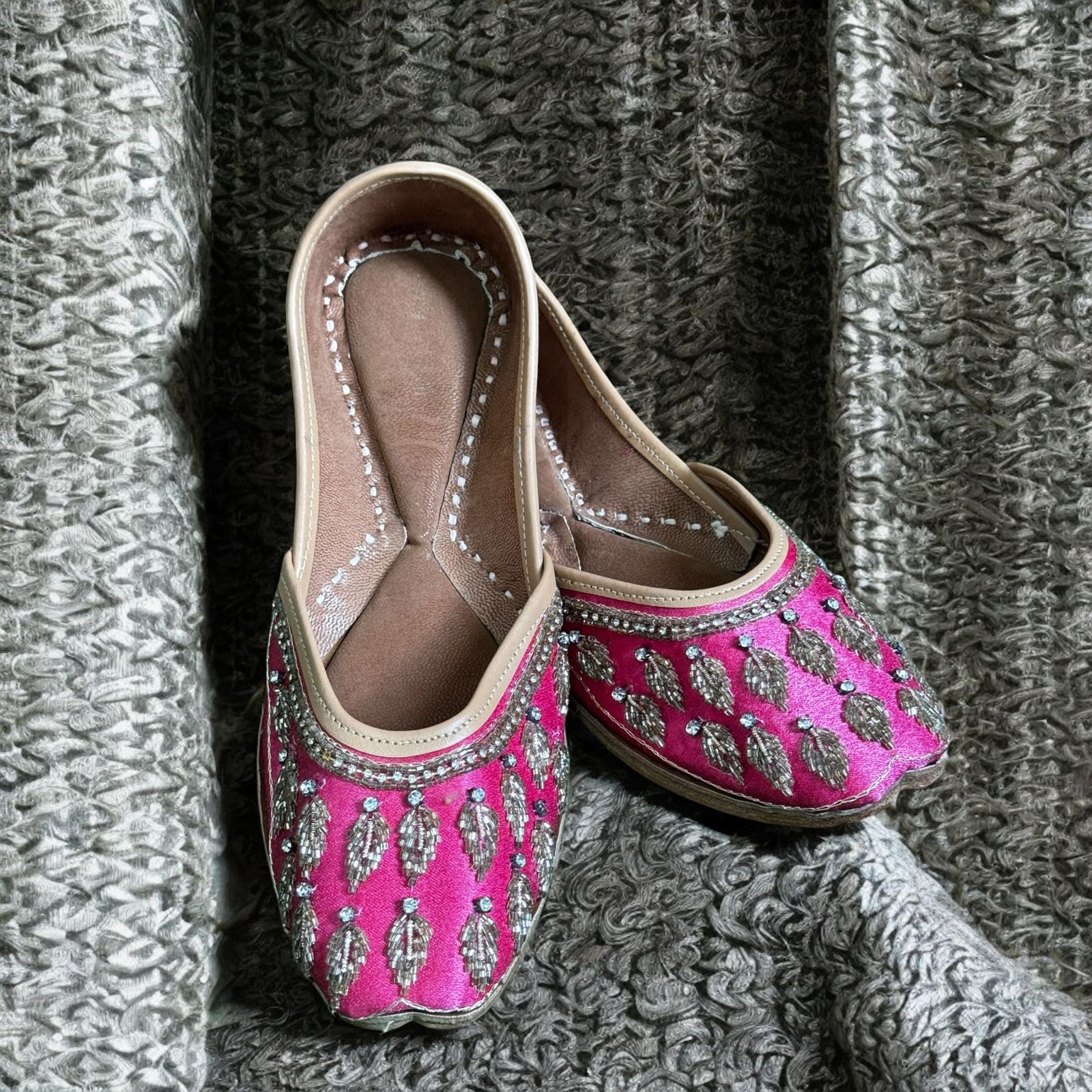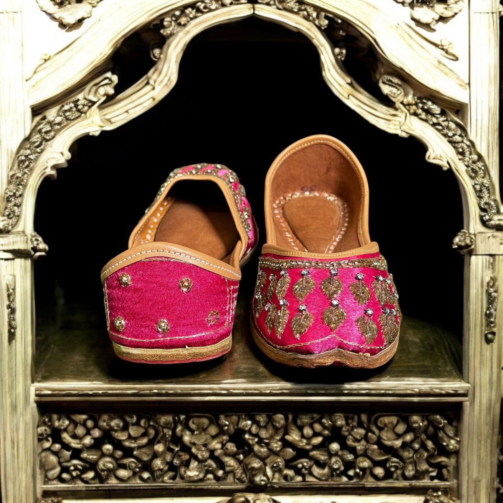 A rich, rani silk base with silver leaf embroidery showcasing fine, heirloom motifs in an old world style! The back of the jutti is a modern contrast to the traditional front, designed in an avant-garde style, for the modern day woman, who loves her traditions, yet is futuristic in her fashion expression!