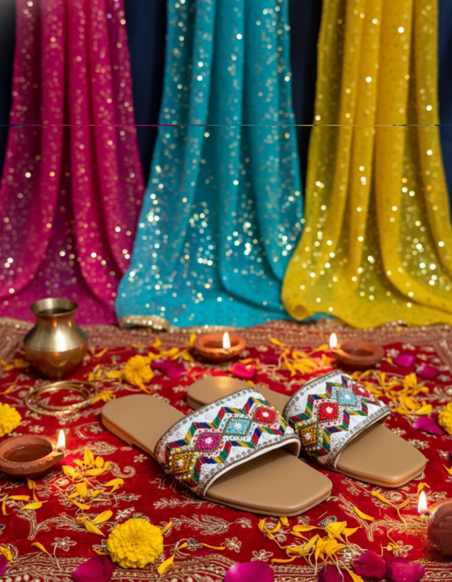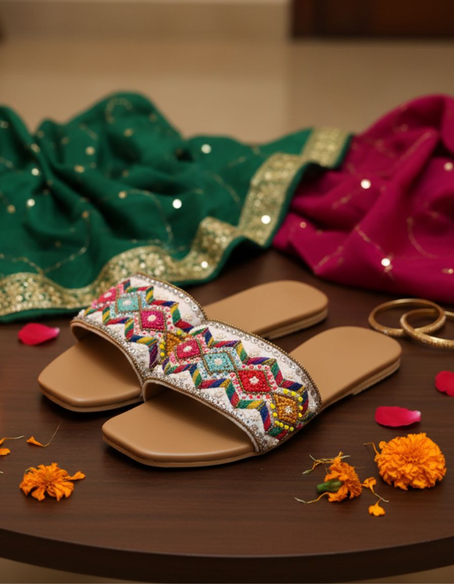 The base is a smooth tan sole with a clean, modern silhouette—comfortable, minimalistic, and perfect for ethnic as well as fusion outfits. Styled against rich green and magenta dupattas with gold accents, the footwear exudes a celebratory charm.
