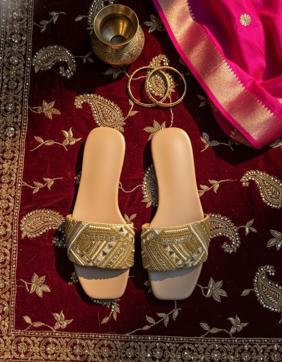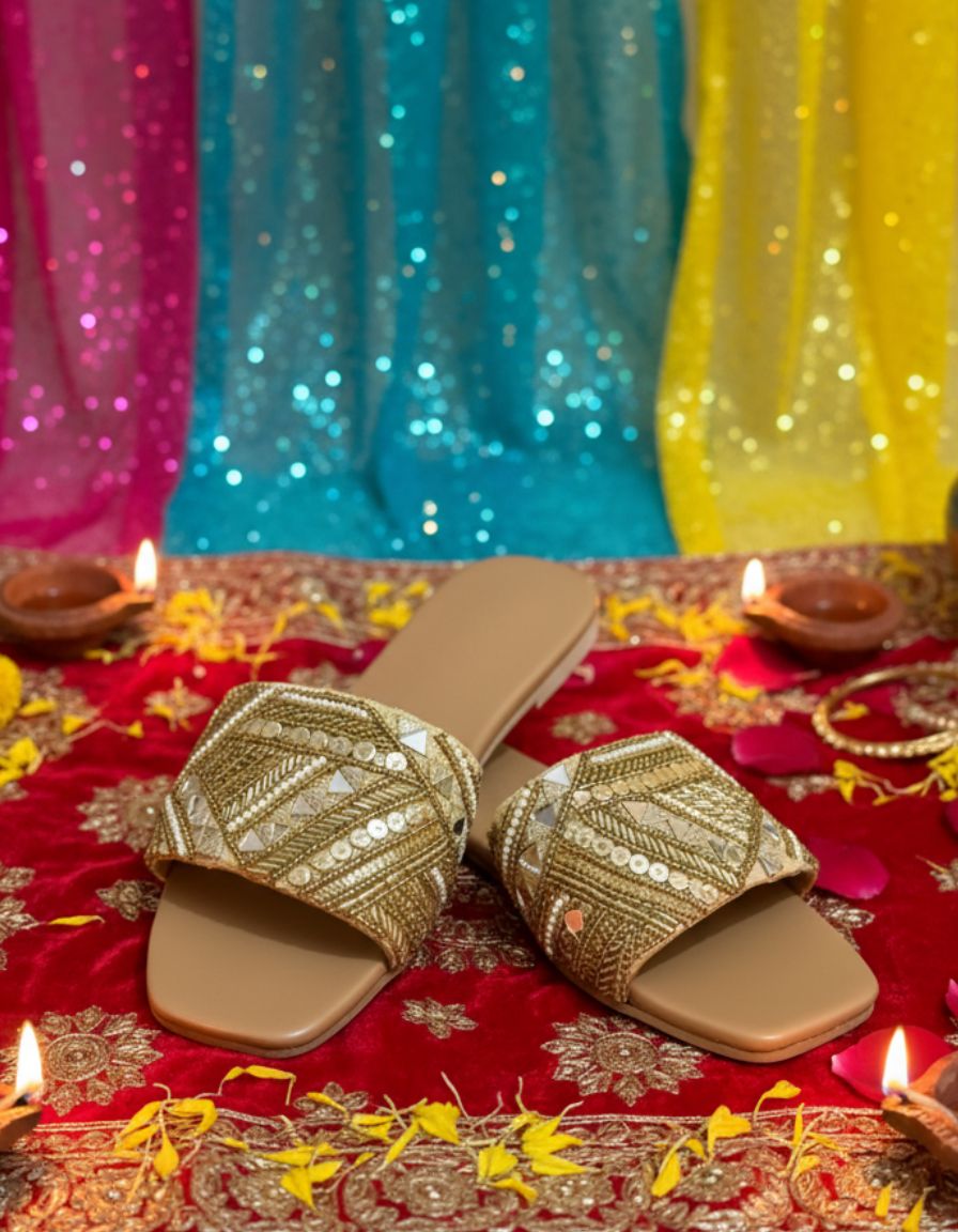 These handcrafted festive slides showcase a luxurious blend of traditional embroidery and modern minimalism. The wide strap features intricate golden threadwork arranged in geometric patterns, beautifully accented with shimmering sequins and mirror-like embellishments. The combination of zari embroidery and reflective detailing adds a rich, celebratory glow to the pair.