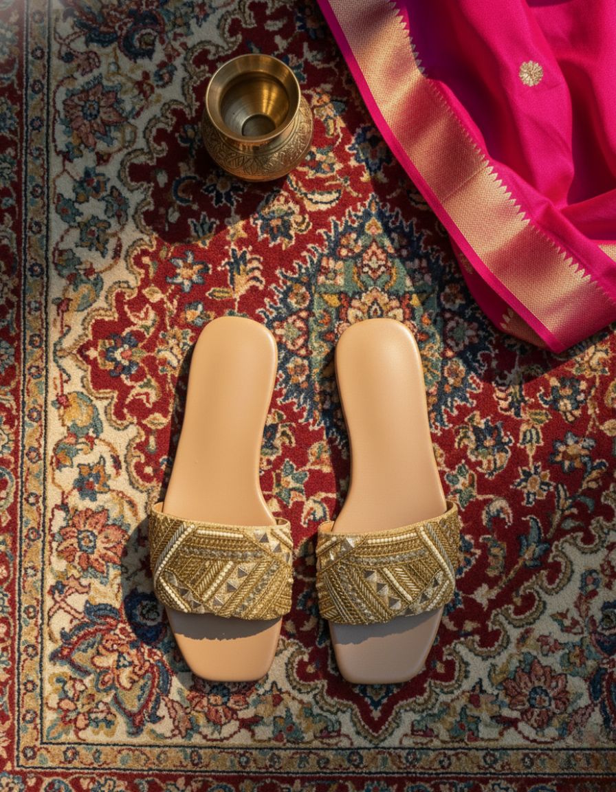 Set on a smooth tan base with a clean square-toe silhouette, the design balances comfort and sophistication—making the slides ideal for ethnic celebrations, weddings, and festive gatherings. The background of shimmering pink, blue, and yellow fabrics, along with marigold petals, rose petals, and lit diyas, enhances the opulent festive aura of the footwear.