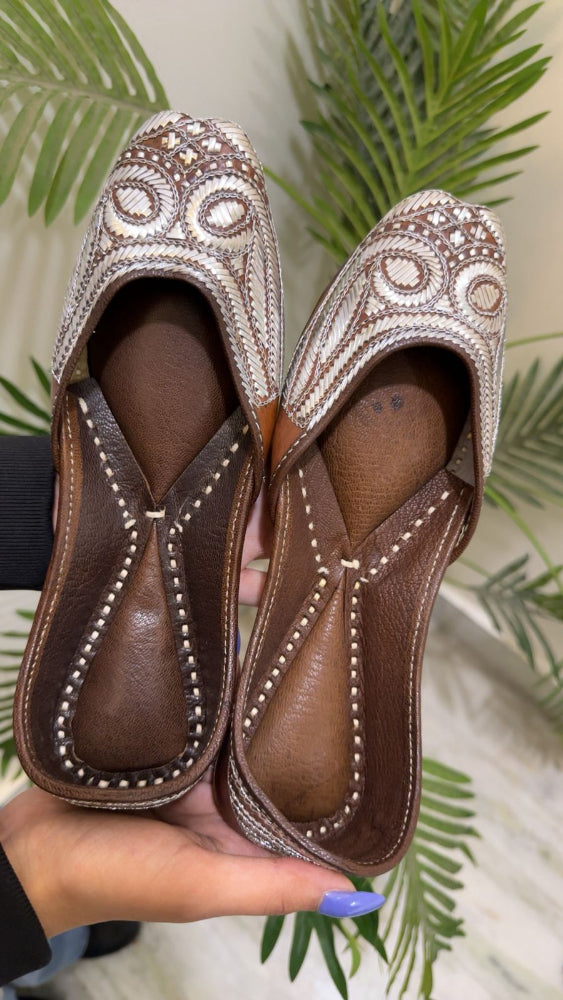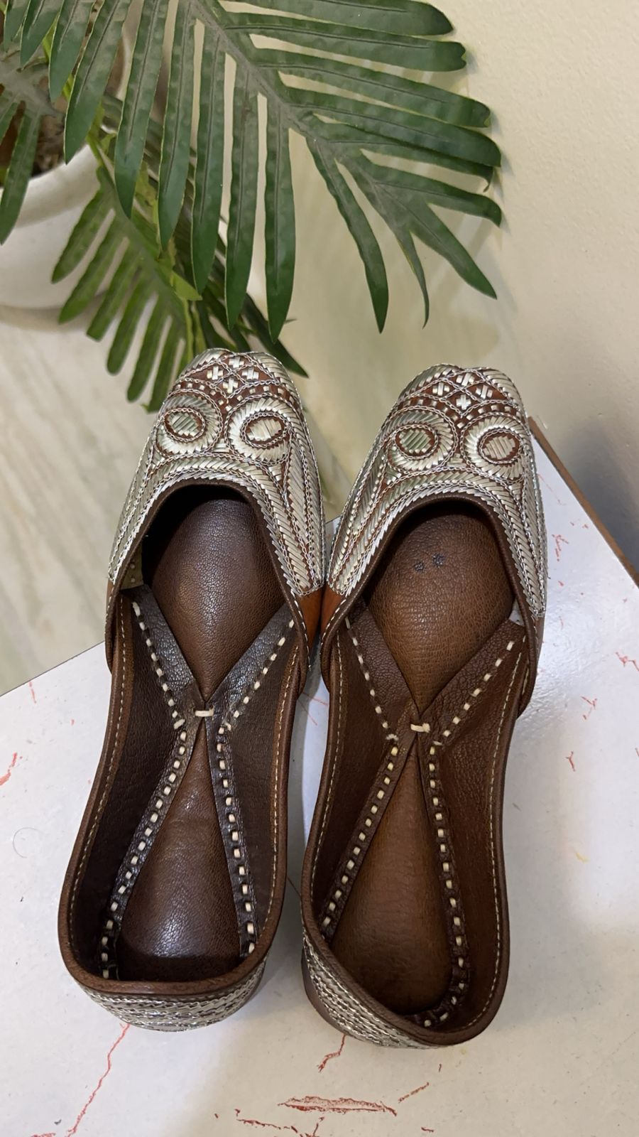 Step into a world of exquisite craftsmanship with our collection, featuring "Mukish” juttis. Meticulously handcrafted, these juttis showcase intricate silver Mukish Work all over, arranged in a mesmerizing geometric pattern. Set on a sophisticated silver base ,elegance and refinement. Elevate your ensemble with timeless sophistication.