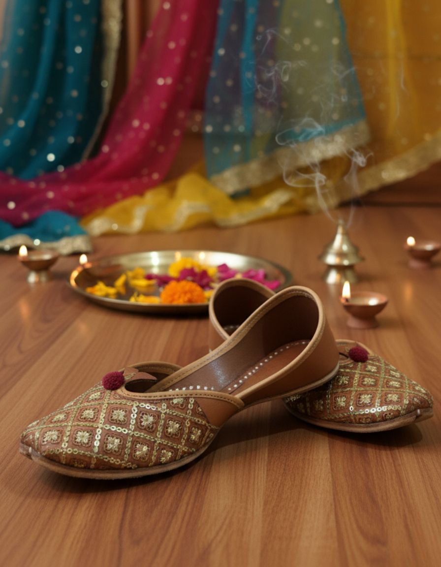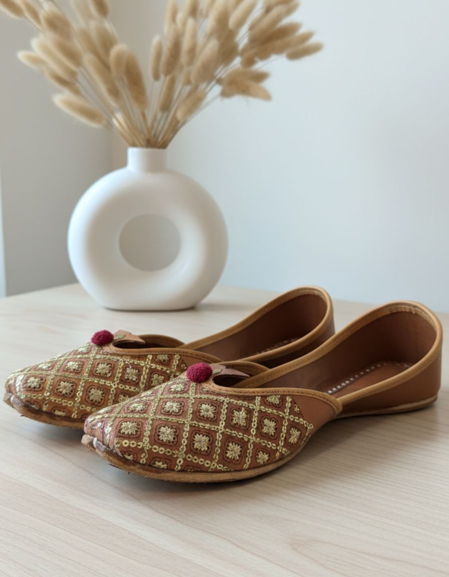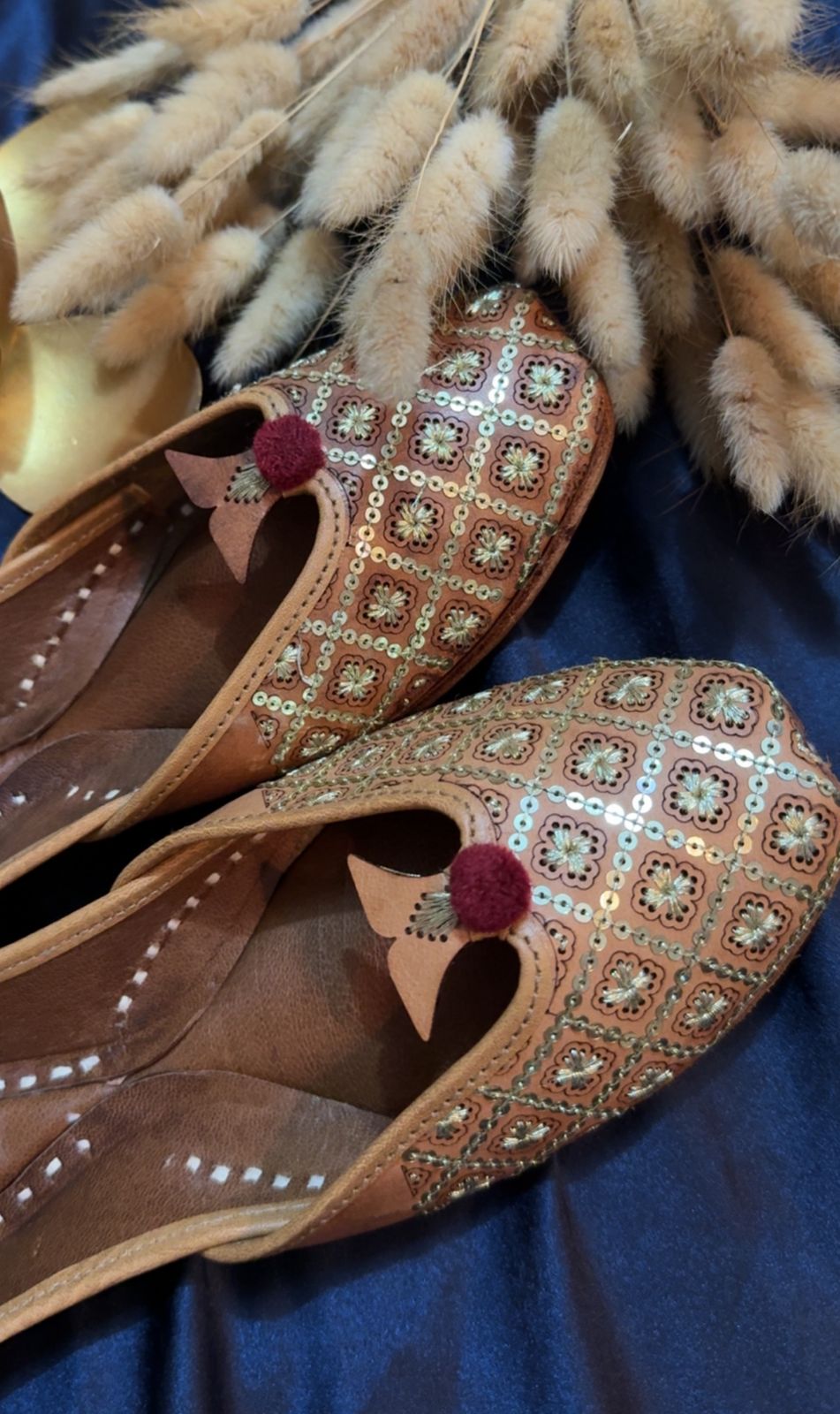 They are intricately embroidered with golden threadwork and sequins arranged in symmetrical diamond patterns. Each jutti has a small maroon pom-pom at the top, adding a classic traditional touch. The inner lining is tan brown, smooth, and neatly stitched.